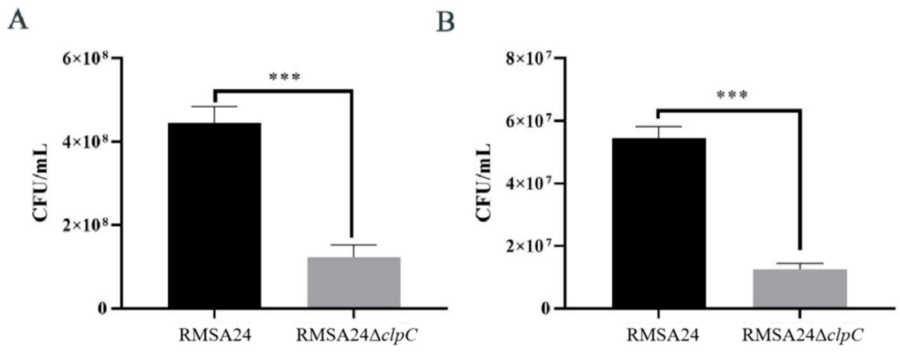 3.6. Effect of clpC Knockout on Biofilm Formation in RMSA24