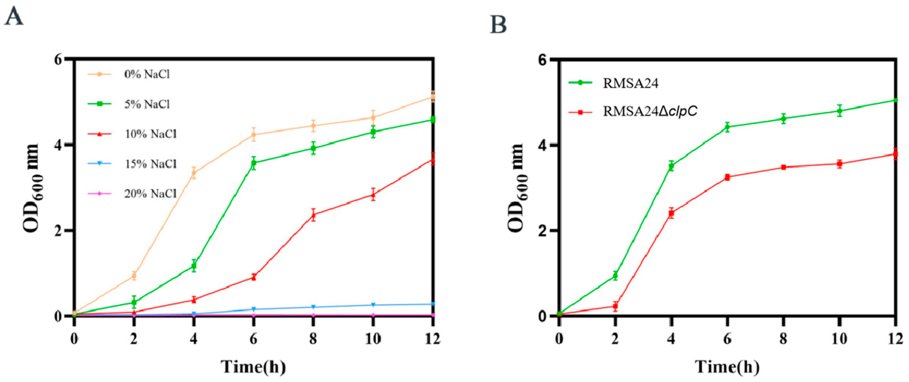 3.5. Effect of clpC Knockout on Hyperosmotic Stress Tolerance in RMSA24