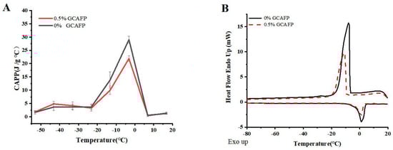 Figure 1A illustrates the effects of GCAFP on the apparent specific heat of wet gluten protein. Similar to dough, wet gluten protein exhibits latent heat variations during phase transitions. Within the temperature range of −60 to 20 °C, distinct phase transitions occurred, leading to notable fluctuations in apparent specific heat. At low temperatures (−60 °C to the freezing point), the apparent specific heat gradually increased with rising temperature, particularly between −15 °C and 1 °C. Before the onset of phase transition (at −53.15 °C), the apparent specific heat of the control and GCAFP samples was 1.67 ± 0.61 and 1.86 ± 0.23 J/(g·°C), respectively. Across the range of −53.15 to 33.15 °C, the apparent specific heat of the GCAFP-treated samples consistently remained higher than that of the control. During the phase transition, as the temperature increased to −3.15 °C, the apparent specific heat of GCAFP-treated sample reached 29.02 ± 1.31 J/(g·°C), which was significantly higher than that of the control (21.91 ± 1.02 J/(g·°C), p < 0.05). After the transition, ice crystals had completely transformed into liquid water, eliminating the influence of latent heat; thus, further temperature increases caused only minimal changes in specific heat. Consequently, further temperature increases resulted in minimal changes in apparent specific heat. Compared with dough, the apparent specific heat of wet gluten exhibited greater variability. Wet gluten protein, an essential dough component, has lower hydrophilic content and higher water fluidity, allowing it to release substantial heat rapidly during freezing. This suggests that the influence of GCAFP on the apparent specific heat of gluten protein plays a key role in its overall effect on dough freezing behavior. The addition of GCAFP enhanced water fluidity within the gluten matrix, slowing water migration. As a result, freezing became more difficult in the GCAFP group, and the progression of apparent specific heat changes was more gradual from a thermodynamic perspective.