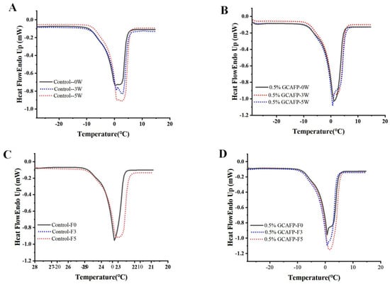 Figure 2A,B presents the melting curves of wet gluten protein following frozen storage. Compared with those of the freeze–thawed samples, the melting curves exhibited noticeable shifts. After both 3 and 5 weeks of frozen storage, the degree of melting curve shift in the control group was greater than that observed in the GCAFP group.
