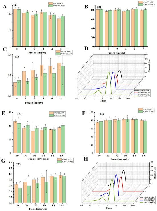 Understanding the behavior of water within gluten protein under different storage and processing conditions is crucial for improving the quality and stability of dough. In this context, the T2 relaxation time distribution curve was used to analyze water dynamics within gluten protein subjected to freezing and freeze–thaw cycles. According to Figure 3, the typical T2 relaxation time distribution of wet gluten protein was divided into three proton peaks: T21 (0.03–10 ms), T22 (10–90 ms), and T23 (110–900 ms). Based on the binding strength of water molecules to food macromolecules, T21, T22, and T23 correspond to bound water, semi-free water, and free water, respectively [26,27]. After frozen storage, T21 in the control sample decreased, T22 increased initially and then declined slightly, and T23 increased. After 5 weeks of frozen storage, the reduction in T21 and rise in T23 indicated that frozen storage treatment increased water fluidity in wet gluten protein. This might result from ice crystal recrystallization, which disrupted the gluten structure and reduced protein cross-linking, thereby weakening the water-binding ability of gluten [28]. In contrast, GCAFP prevented the decrease of T21 and increase of T23 in the wet glutein protein, indicating that GCAFP addition mitigated the effects of freezing and frozen storage on water fluidity, consistent with previous studies [17,29].