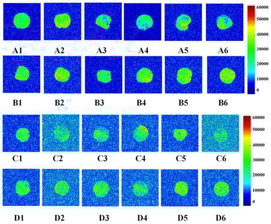 Change in water distribution of wet gluten (the colors blue through bright yellow to red represent increasing moisture contents in wet gluten samples). A1, A2, A3, A4, A5 and A6 were the water distribution after 0, 1, 2, 3, 4, 5 W frozen storage of 0% GCAFP gluten protein; B1, B2, B3, B4, B5 and B6 were the water distribution after 0,1,2,3,4,5 W frozen storage of 0% GCAFP gluten protein; C1, C2, C3, C4, C5 and C6 were the water distribution after 0, 1, 2, 3, 4, 5 freeze–thaw cycles of 0% GCAFP gluten protein; D1, D2, D3, D4, D5 and D6 were the water distribution after 0, 1, 2, 3, 4, 5 freeze–thaw cycles of 5% GCAFP gluten protein. Note: GCAFP: Grass carp antifreeze peptide.