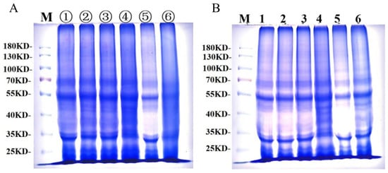 Protein Extraction: Wet gluten protein (80 mg) was accurately weighed into an Eppendorf tube and mixed with 500 μL of lysis buffer containing 1 mM PMSF. Samples were homogenized six times using a ferromagnetic bead grinder and incubated at 4 °C for 60 min with gentle inversion. Ultrasonic disruption was then performed on ice (5% amplitude; 2 s on, 2 s off, for a total of 1 min). Samples were centrifuged at 17,000× g for 15 min at 4 °C, and 380 μL of the supernatant was collected. Proteins were precipitated by adding 1520 μL of pre-cooled methanol-acetonitrile solution (1:1, v/v) and incubated at −20 °C overnight. After centrifugation (17,000× g, 15 min, 4 °C), the supernatant was discarded, and the pellet air-dried. The pellet was resuspended in 100 μL of lysis buffer and sonicated under the same conditions. After a second centrifugation (17,000× g, 15 min, 4 °C), the supernatant was collected. A 30 μL aliquot of the supernatant was mixed with 6 μL of 6× reducing SDS-PAGE loading buffer, vortexed, briefly centrifuged, and heated at 99 °C for 8 min. The sample was then briefly centrifuged, and the supernatant loaded onto the gel.