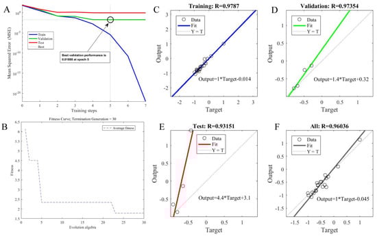 (A)—error drop curve of neural network; (B)—the fitness curve of the extraction rate; the regression performance of extraction rate: (C)—training curve; (D)—validation curve; (E)—test curve; (F)—Comprehensive curve.