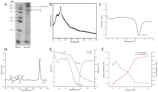 (A)—electrophoretic pattern of eel bone collagen; (B)—XRD plot of eel bone collagen; (C)—DSC curve of eel bone collagen; (D)—Raman spectrum of eel bone collagen; (E)—TGA and DTG curves of eel bone collagen; (F)—rheological characteristics of eel bone collagen solution.