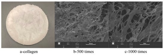 The surface microstructure of the collagen was observed at magnifications of 50× and 1000× under a 5.0 kV accelerating voltage, and scanning images were acquired.