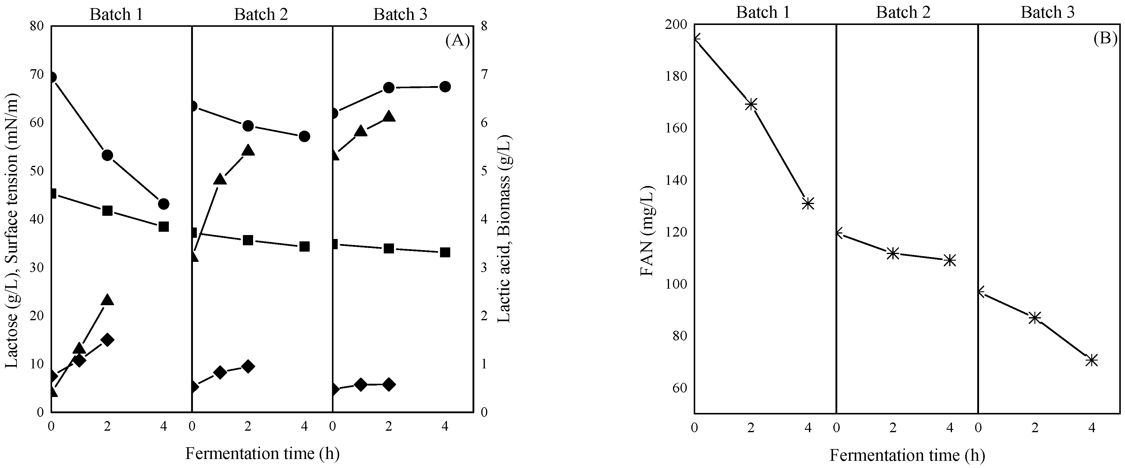 - Souza, E.C.; Oliveira de Souza de Azevedo, P.; Domínguez, J.M.; Converti, A.; Pinheiro De Souza Oliveira, R. Influence of temperature and pH on the production of biosurfactant, bacteriocin and lactic acid by Lactococcus lactis CECT-4434. CyTA J. Food 2017, 15, 525–530. [Google Scholar] [CrossRef]
