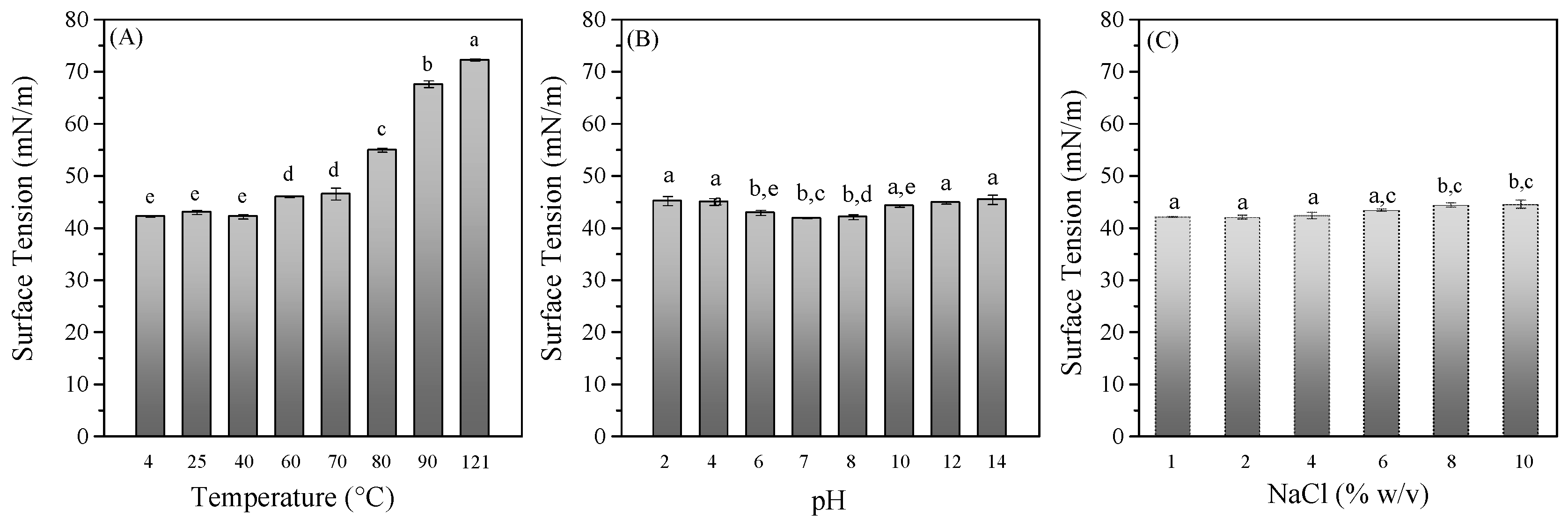 - Ghasemi, A.; Moosavi-Nasab, M.; Setoodeh, P.; Mesbahi, G.; Yousefi, G. Biosurfactant production by lactic acid bacterium Pediococcus dextrinicus SHU1593 grown on different carbon sources: Strain screening followed by product characterization. Sci. Rep. 2019, 9, 5287. [Google Scholar] [CrossRef]