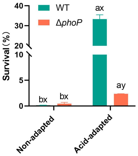 Compared to the WT, ΔphoP exhibited no obvious growth defects whether in acidic or non-acidic environments (Figure A1). Based on the above, this study proceeded to further acid challenge tests. Acid-adapted or non-acid-adapted WT and ΔphoP were acid-challenged under strong acid condition at pH 3.0, and their survival rates are shown in Figure 1. The survival rates of WT and ΔphoP under strong acidic condition without acid adaptation were 0.14% and 0.43%, respectively. After acid induction in a slightly acidic environment at pH 5.4, both strains developed the acid tolerance effect with significantly higher survival rates. In the control group, the survival rate was increased to 33%, while phoP deletion led to a significant reduction in acid tolerance to only 2.38%. This suggested that phoP was activated under slightly acidic condition and had a crucial role in the acid tolerance response of S. typhimurium.