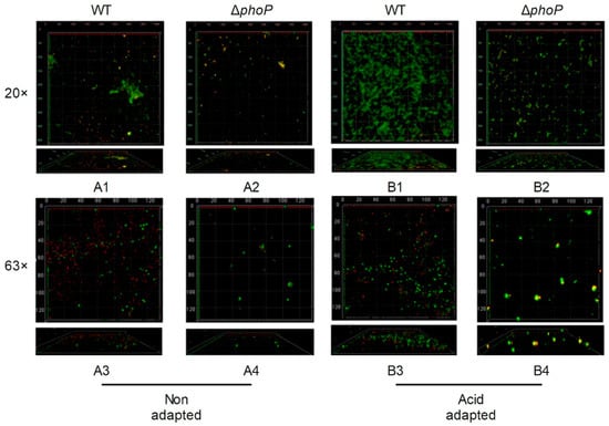 For CLSM analysis, acid-adapted or non-acid-adapted WT and ΔphoP were cultured in 35 mm × 10 mm cell culture dishes (Sigma, Burlington, MA, USA) containing 4 mL of LB broth, achieving a final concentration of 6 log CFU/mL. The dishes were incubated at 25 °C for 4 d. After incubation, the biofilms were washed three times with sterile PBS to remove planktonic bacteria. The biofilms were stained for 30 min in the dark using the LIVE/DEAD BacLight kit L-7012 (Thermo Fisher, Waltham, MA, USA). This kit uses Syto 9 to stain intact bacterial membranes and propidium iodide to stain bacteria with damaged membranes. CLSM imaging was conducted using the LSM 880 (Zeiss, Oberkochen, Germany) with a 63 × oil immersion objective and 488 nm argon laser. Fluorescence was captured in two emission ranges: 480~500 nm for Syto 9 and 490~635 nm for propidium iodide. Three-dimensional projections were created from z-stack data using ZEN Blue Lite 2.3 software.