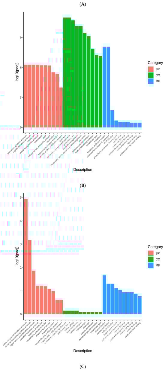 GO analysis classification of differentially expressed genes. (A): GO enrichment of down-regulated genes in Non-adapted ∆phoP vs. Non-adapted WT; (B): GO enrichment of up-regulated genes in acid-adapted ∆phoP vs. Non-adapted ∆phoP; (C): GO enrichment of down-regulated genes in acid-adapted ∆phoP vs. acid-adapted WT. Different colours represent different functional annotation groups: red indicates biological processes (BP); green indicates cellular components (CC); blue indicates molecular functions (MF).