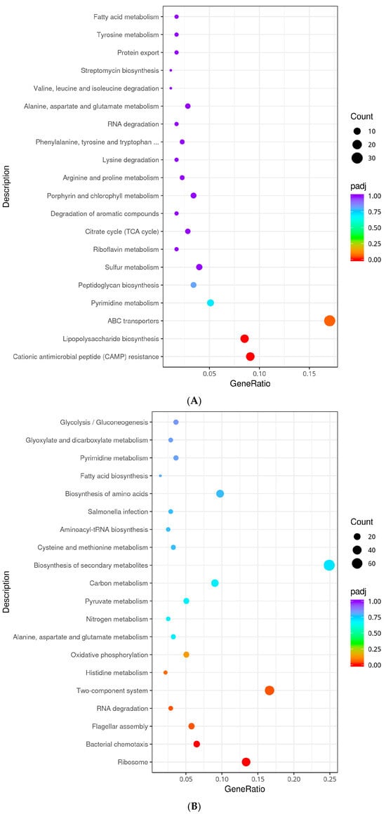 The regulatory pathways involved in DEGs were further obtained by pathway significant enrichment, and the results are shown in Figure 6. In the absence of acid adaptation, the ∆phoP mutant relative to the WT was enriched with 30 (ybjZ, cysW, mglB, etc.) and 21 (yfbE, rstA, phoQ, phoP, pagC, etc.) DEGs in the ABC transporters (seo02010) and two-component system (seo02020) pathways, respectively, which are related to environmental information processing. Furthermore, the ∆phoP mutant was enriched with 6 (ybjG, uppS, dacC, dacB, etc.) and 15 (lpxO, rfaQ, yrbH, yjdB, pagP, etc.) DEGs in the peptidoglycan biosynthesis (seo00550) and lipopolysaccharide (LPS) biosynthesis (seo00540) pathways, which are involved in membrane modification. Additionally, 16 DEGs (pmrD, yfbE, pmrF, yfbG, phoQ, phoP, etc.) were enriched in the cationic antimicrobial peptide (CAMP) resistance (seo01503) pathway (Figure 6A). This suggests that phoP deletion reduces mechanisms related to environmental sensing, membrane biosynthesis and stress resistance in S. typhimurium.