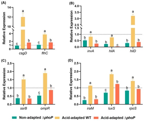 Effects of acid adaptation on flagellum and biofilm (A), virulence (B), two-component regulatory system (C) and stress response (D) gene expression in Salmonella typhimurium and its phoP-mutant strains. WT: Salmonella typhimurium ATCC 14028 wild-type strain; ∆phoP: Salmonella typhimurium phoP gene deletion strain. Different colours represent different experimental groups: green indicates non-acid-adapted ∆phoP; yellow indicates acid-adapted WT; red indicates acid-adapted ∆phoP. “a~c”: Different letters indicate significant difference (p < 0.05). Black dashed line: Non-acid-adapted WT gene expression as a baseline. Data were presented as the mean ± standard error (n = 3).