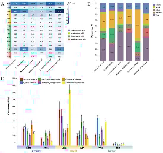 Taste activity and composition of key flavor-related amino acids in six bivalve species. (A) Heatmap of Taste Activity Values (TAVs). TAV was calculated as the ratio of amino acid concentration to its taste threshold [5]. Color intensity reflects TAV magnitude; TAV ≥ 1 indicates a meaningful contribution to taste. (B) Proportional composition of major flavor-related amino acids, including taurine (Tau), across species. (C) Statistical comparison of content levels for individual flavor amino acids. Bars sharing the same letter are not significantly different (Tukey’s HSD test, p < 0.05). Error bars represent mean ± SD (n ≥ 3).