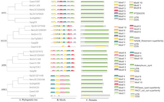 Based on integrated KEGG pathway enrichment and genomic database analysis, we identified four key rate-limiting enzymes involved in the synthesis and metabolism of umami compounds: glutamate-oxaloacetate transaminase (GOT), glutamate dehydrogenase (GLUD), adenylosuccinate synthase (ADSS), and hypoxanthine phosphoribosyltransferase (HPRT) (Figure 4). Bioinformatics analysis revealed conserved domain architectures across the six bivalve species. The GOT1 gene consistently encoded a protein belonging to the PTZ00376 superfamily. In contrast, the GLUD1 gene encoded a NADB_Rossmann superfamily protein in C. sinensis, whereas it was classified under the GdhA superfamily in the other five species. ADSS genes were highly conserved, all falling within the adenylosucc_synt superfamily. HPRT1 was assigned to the PRTases_type1 superfamily in most species, with the exception of C. sikamea, where it was identified as a member of the PACT_coil superfamily.