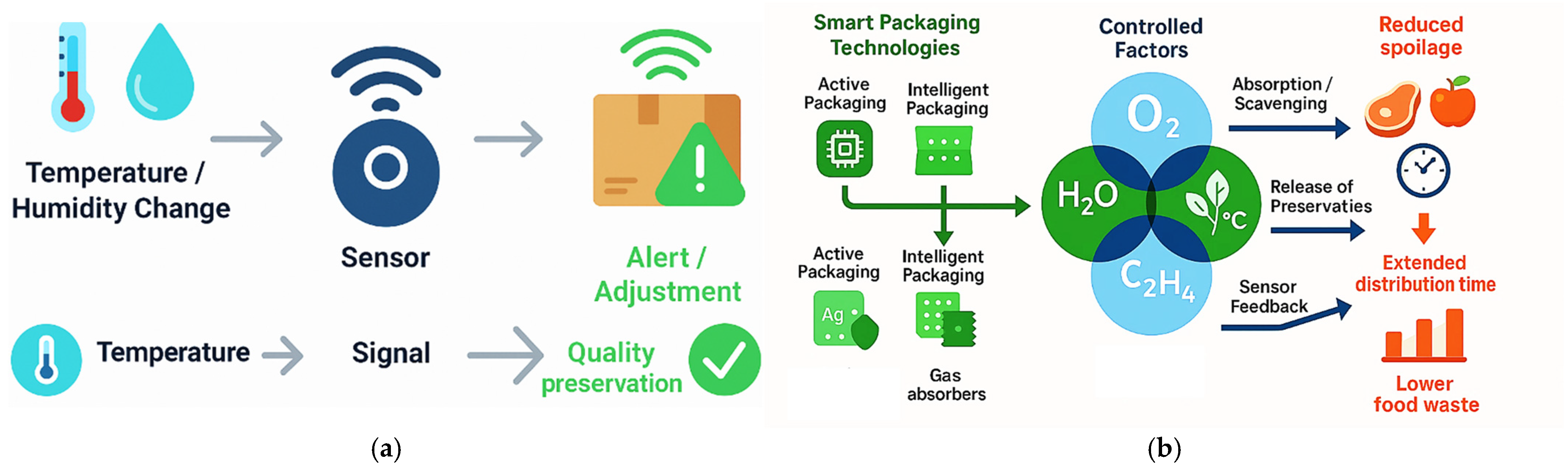 Figure 5. Packaging methods for the extension of food shelf life: (a) temperature and humidity sensors in smart packaging; (b) applications of smart packaging shelf-life extension.