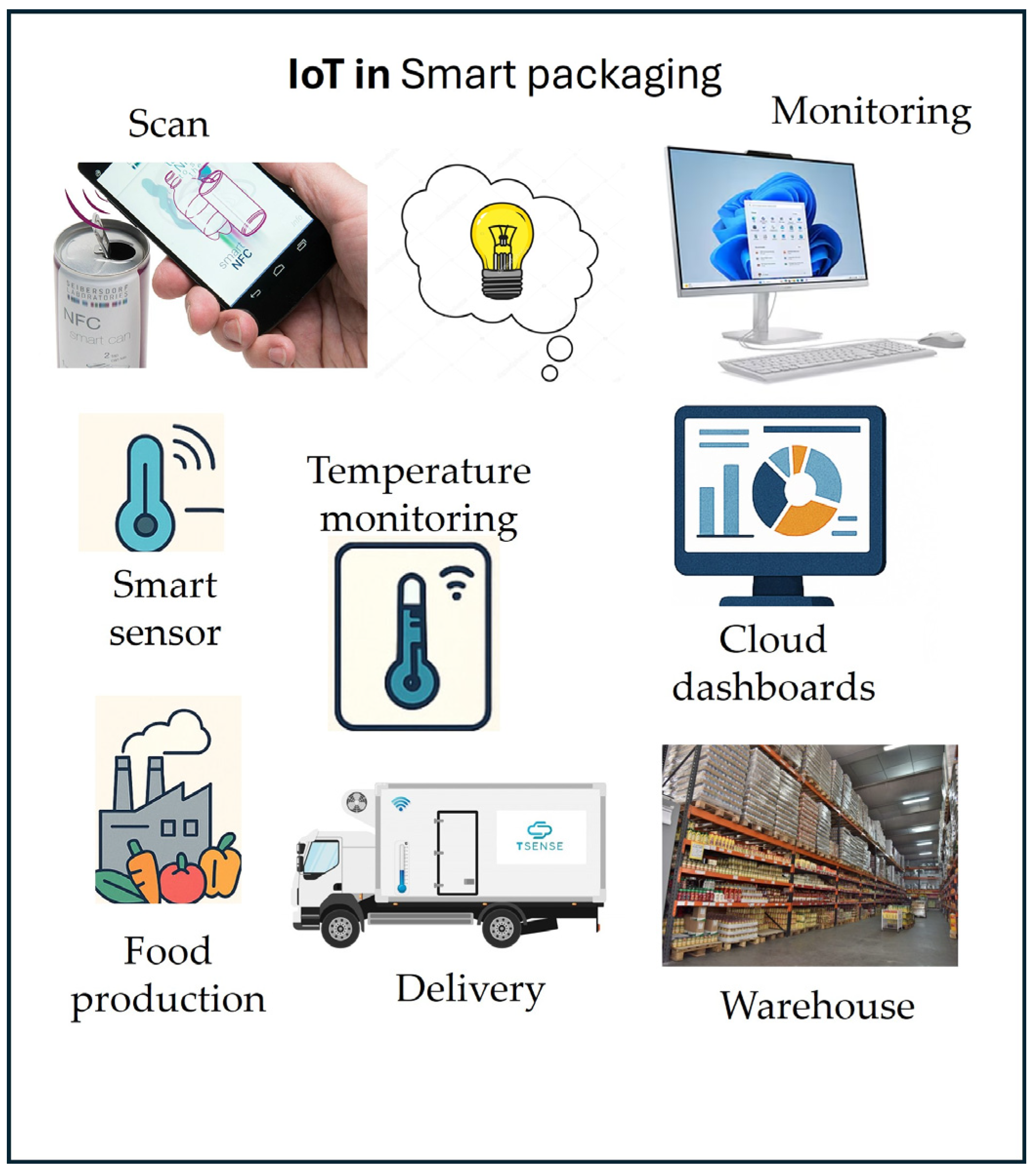 Intelligent packaging systems extend the concept of active preservation by embedding mechanisms that can monitor, record, and communicate information regarding the product’s status or the conditions surrounding it (Figure 3). Unlike purely active designs, their primary function is informational: enabling stakeholders across the supply chain to respond to quality changes in real time rather than passively relying on predefined shelf-life estimates.
