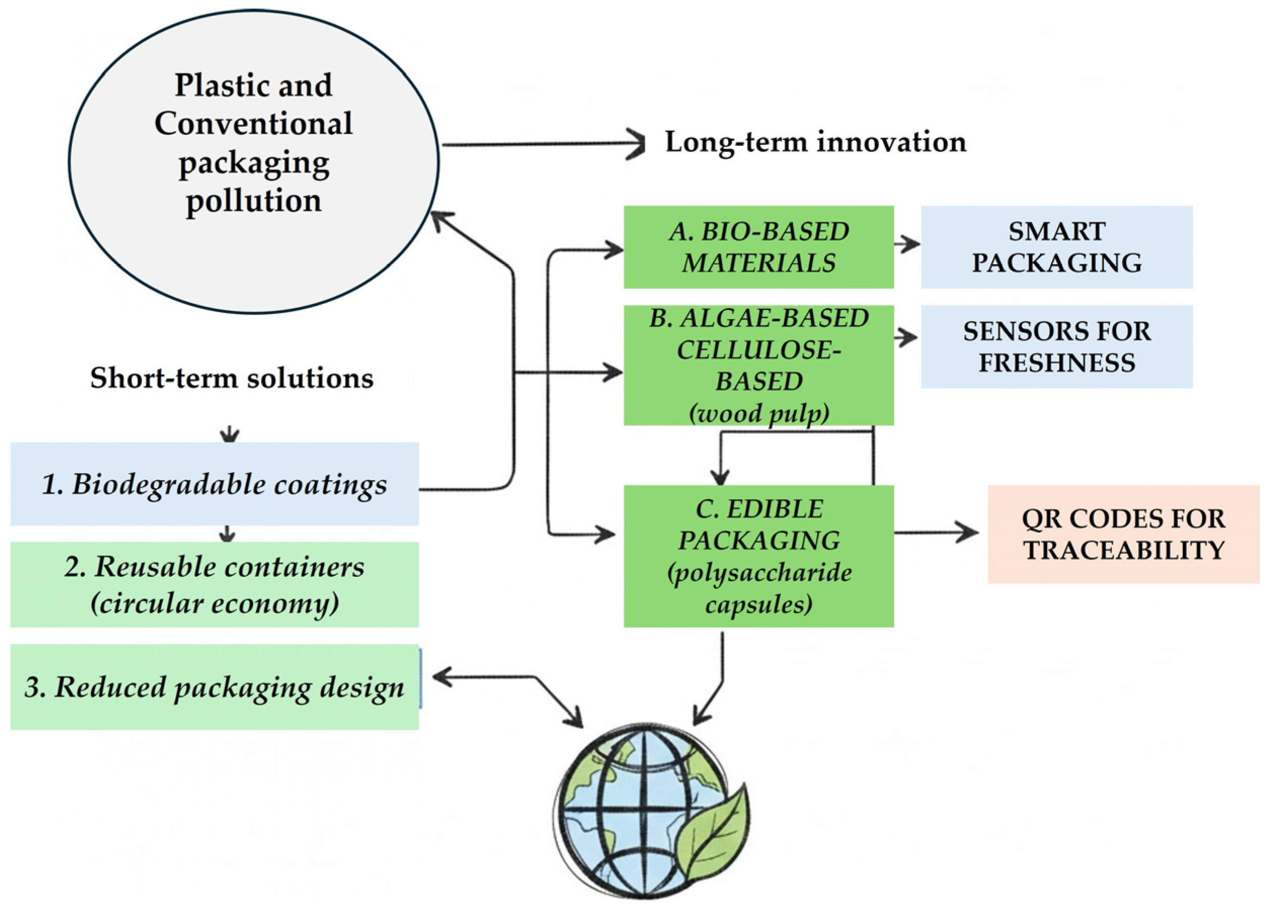Technological classifications distinguish between active packaging, which interacts chemically or biologically to maintain quality, and intelligent packaging, which communicates product status [2,11,12,13,14,21,22]. Increasingly, these functionalities are integrated, for example, into edible films derived from fruit or vegetable sources that incorporate freshness sensors, thereby combining renewable materials with digital monitoring capabilities to reduce food waste.