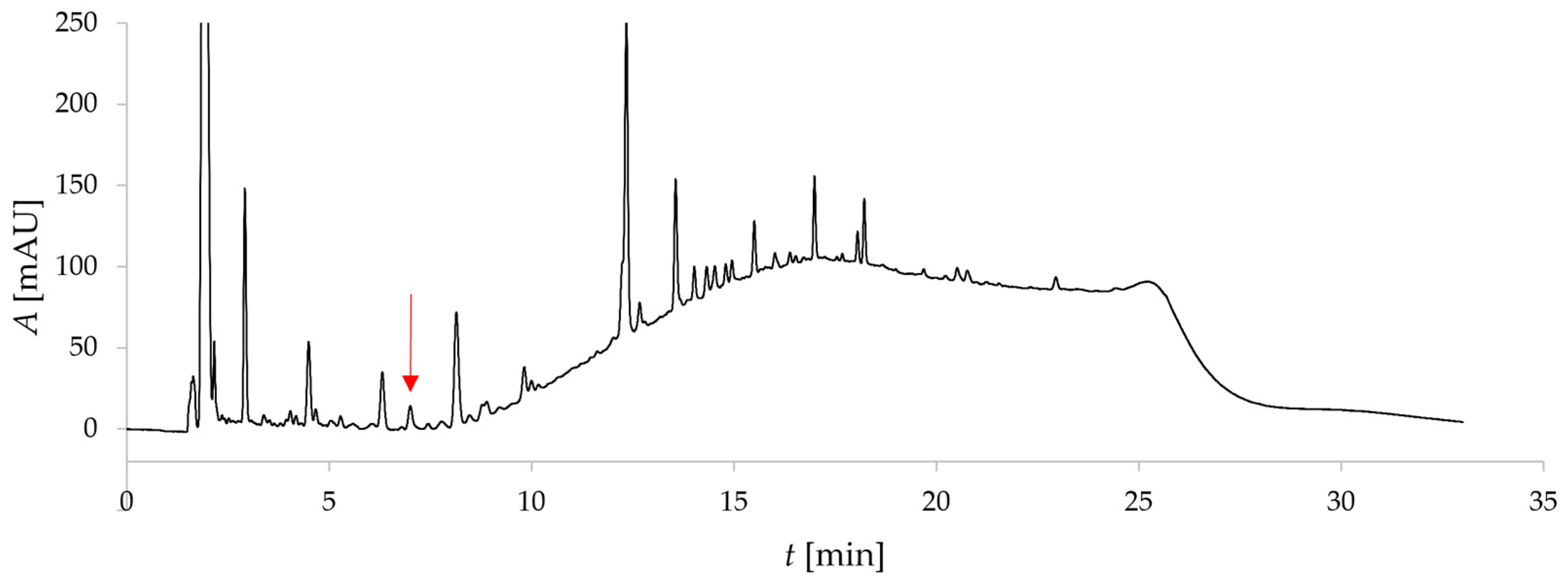 Analysis of samples was performed on a reverse-phase Waters ACQUITY Premier BEH C18 column with dimensions of 2.1 × 150 mm and a particle size of 1.7 µm. The flow rate was set to 0.2 mL/min, the injection volume to 1 µL, and the column temperature to 45 °C. UV detection was performed at a wavelength of 190 nm without using a reference wavelength. Sampling was done at 5 Hz. The mobile phase consisted of 0.1% phosphoric acid in Milli-Q water (A) and acetonitrile (B). The following gradient elution program was used to achieve baseline separation: 0–2 min, 50% B; 2–12 min, 50–95% B; 12–19 min, 95% B; 19–20 min, 95–50% B; and 20–35 min, 50% B.