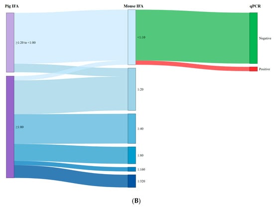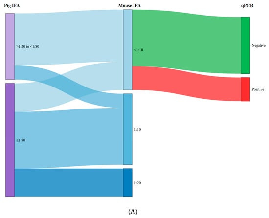Figure 1 shows Sankey diagrams illustrating the relationship between the antibody titers of the pigs tested and the titers of mice inoculated with raw ham (Figure 1A) and target tissues (Figure 1B), as well as with the qPCR results. As can be observed in Figure 1A, high antibody titers in pigs (≥1:80) were associated with seropositivity in mice following inoculation with extracts derived from raw ham samples (75.0% (18/24)). Conversely, seropositive pigs showing low titers (<1:80) resulted in a lower percentage of seropositive mice (21.4% (3/14)). A similar trend was observed for target tissues (Figure 1B), where the association between pigs with low titers and mice seronegativity (85.7% (12/14)) and pigs with high titers and mice seropositivity (95.8% (23/24)) was even more pronounced. In both raw ham and target tissues, we observed a strong association between mouse seronegativity and qPCR negativity, specifically 70.6% and 92.3%, respectively. Nevertheless, the antibody titers obtained in mice inoculated with target tissue samples were significantly higher (p < 0.001) compared with those inoculated with raw ham extracts. Specifically, the titer range for mice inoculated with raw ham was 1:10–1:20, compared to 1:20–1:320 for those inoculated with target tissues.