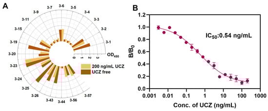(A) Identification of UCZ mimotope from phage display peptide library. (B) Competitive inhibition curves of phage ic-ELISA.
