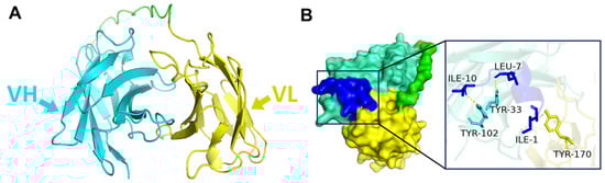 (A) The structure of UCZ-mAb, Cyan: Heavy chain, Yellow: Light chain. (B) Binding sites and interactions between UCZ-mAb and UCZ mimotope peptide.