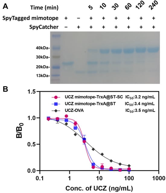 Self-assembly and characterization of UCZ SpyTagged mimotope and SpyCatcher. (A) SDS-PAGE (“+” indicates presence, “—” indicates absence). (B) ic-ELISA based on UCZ-OVA. UCZ SpyTagged mimotope and UCZ SpyTagged mimotope-SpyCatcher.