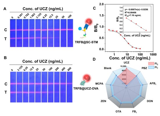 The IC50 and cut-off of the standard inhibition curve of LFIA are 7.16 ng/mL and 50 ng/mL under the above optimized conditions, shown in Figure 4A,C. Although the IC50 of UCZ-OVA and SpyTagged mimotope were similar in the ic-ELISA, the sensitivity of LFIA based on SpyTagged mimotope was about 16-fold higher than that of UCZ-OVA (Figure 4B). The enhanced sensitivity may be attributed to the fact that the natural affinity of mimotope peptides derived from phage display is lower than that of chemically synthesized antigens. Additionally, the antigen–antibody reaction time in LFIA (15 min) is shorter than in ELISA (1 h), and the dissociation rate of mimotope peptides may be faster than that of chemically synthesized antigens.