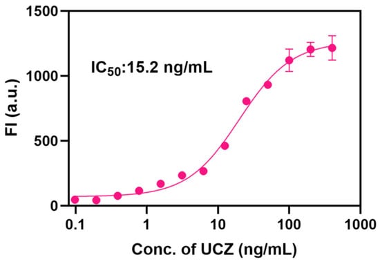 Detection performance. As shown in Scheme 1C, the MSIA of specific steps is as follows: 6.25 μL of MB@mAb and 1 μL of TRFB@SC-STM are diluted with 100 μL of PBS, respectively, and mixed per sample. Mix 100 μL of the mixture and 100 μL of UCZ standard (0–400 ng/mL) in 10% methanol-PBS into a black 96-well plate. After incubation for 15 min at 37 °C, followed by magnetic separation for 2 min, 100 μL of supernatant was collected and measured by a multifunctional enzyme immunoassay analyzer (EX: 340 nm, EM: 613 nm). The limit of detection and quantification for the assays were calculated by 10–maximal inhibitory concentrations (IC10) and 20–maximal inhibitory concentrations (IC20), respectively, obtained from four-parameter logistic curve fits formula: