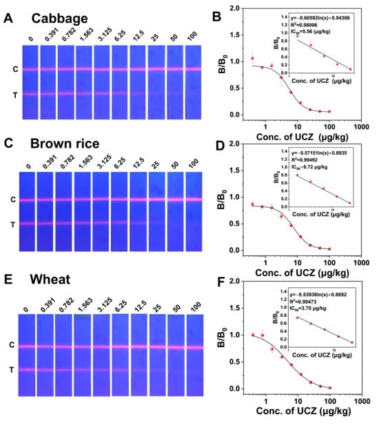 (A) Physical drawing of the detection of UCZ in cabbage. (B) Calibration curves for detection of UCZ in cabbage. (C) Physical drawing of detection of UCZ in brown rice. (D) Calibration curves for detection of UCZ in brown rice. (E) Physical drawing of detection of UCZ in wheat. (F) Calibration curves for detection of UCZ in wheat.