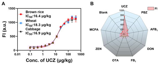 For the MSIA, the cabbage, brown rice and wheat samples spiked with UCZ were pretreated by QuEChERS for qualitative detection, respectively. (Figure 7A) showed the standard curves in the brown rice, cabbage, and wheat matrix. In brown rice, the IC50 was 16.4 μg/kg, the LOD was 2.82 μg/kg with a linear range of 5.43–51.35 μg/kg. In cabbage, the IC50 was 16.9 μg/kg, the LOD was 3.39 μg/kg with a linear range of 6.18–48.2 μg/kg. In wheat, the IC50 was 18.3 μg/kg, the LOD was 3.72 μg/kg with a linear range of 6.79–53.1 μg/kg. Therefore, our developed method has a better sensitivity for the detection of UCZ in brown rice, cabbage, and wheat. As Figure 7B shows, a significant increase in FI for UCZ at 50 ng/mL, with negligible variations for other small molecule contaminations at 2 μg/mL, affirming the high specificity of MSIA based on SpyTagged mimotope for the UCZ determination.