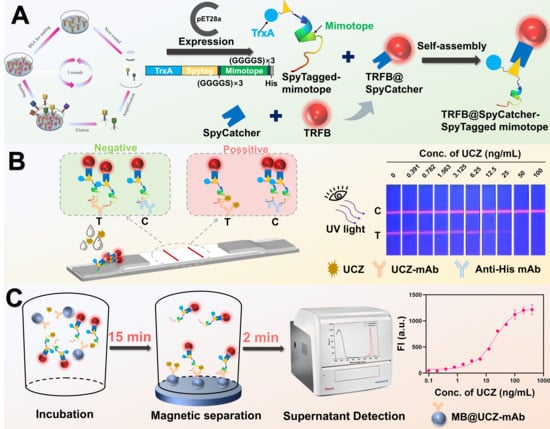 Schematic of the SpyTagged mimotope-based immunoassays for UCZ. (A) Preparation of self-assembly probes based on SpyTagged mimotope. (B) SpyTagged mimotope-based LFIA for UCZ detection. (C) SpyTagged mimotope-based MSIA for UCZ.