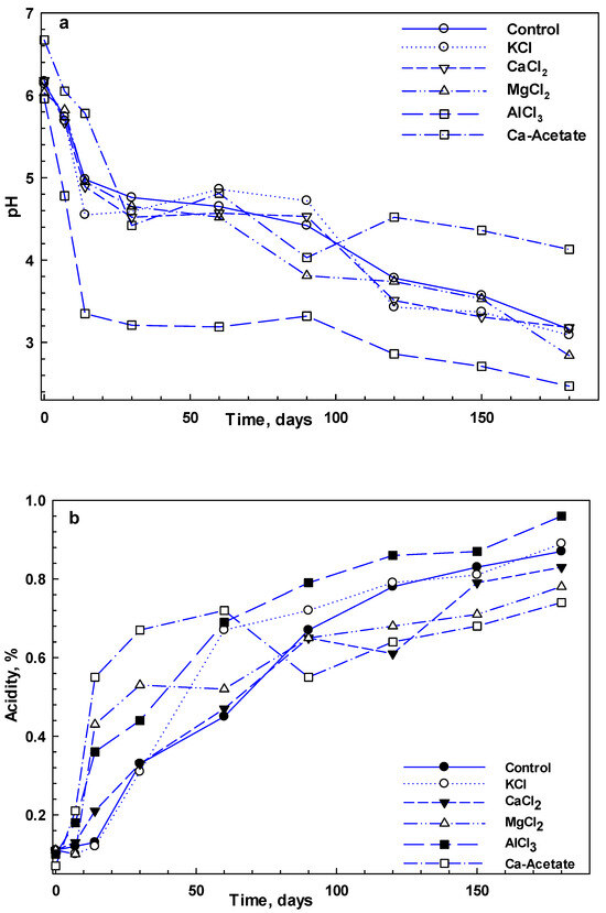 Pickled cucumbers with CaCl2 and calcium acetate showed higher pH values than other samples after 6 months of storage. This finding implied that the dissociation of calcium salts induced acidification of the brine, which reduces the cucumber’s pH at the initial time of fermentation that is favored for conversion sugars to lactic acid and improved the stability of cucumber pickles containing calcium salts [28,29]. In contrast, the control samples showed a moderate pH, while AlCl3, MgCl2, and KCl showed the lowest pH values at the end of the storage period. When the pH approached around 3.6, the textural and sensory properties of the cucumbers became unacceptable; therefore, pH can serve as an indicator of pickle shelf life.