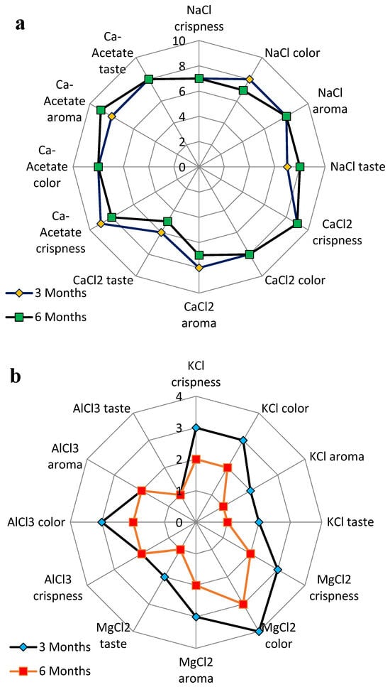 It can be seen that the firmness and crispness of all samples were affected by the type of salts (Figure 5). The high crispness was obtained for the samples containing CaCl2 or Ca-acetate, while the lower values were achieved for KCl, MgCl2, and AlCl3 (Figure 5a,b). Similarly, the taste of the treatments was not the same and the aroma and color were affected more by KCl, MgCl2, and AlCl3. As can be seen in Figure 6, the cucumber pickles containing AlCl3 experienced shrinkage and discoloration. Moreover, the taste, aroma, and color of KCl and MgCl2 were not satisfactory as evaluated by the consumers. Therefore, KCl, MgCl2, and AlCl3 solutions cannot be considered for cucumber pickles, while CaCl2 and Ca-acetate had the best scores from the trained panelists. It has been reported that the ability of calcium to maintain cucumber firmness at low pH is related to its capacity to bind with cell wall polysaccharides. The maximum concentration of Ca2+ in pickled products is less than 25 mM due to its chalky flavor at high concentrations, which is undesirable in the final product. Since calcium can bind to plant cell walls, it is more of interest to determine which calcium salts in the fermented cucumbers would readily be accepted by the consumers. According to Figure 5a, it can be understood that Ca-acetate received higher scores in sensory evaluation, which may be related to the acidic condition of the brine solution, and therefore, the aroma and taste were improved by Ca-acetate. In the view of the panelist, Ca-acetate, CaCl2, and NaCl achieved the best scores, correlating well with their textural properties.