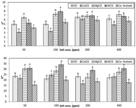 Effect of brine type and concentrations on the color attributes of cucumber pickles after 6 months of storage. The statistically significant difference among the samples at each concentration is provided by alphabetic letters (p < 0.05).