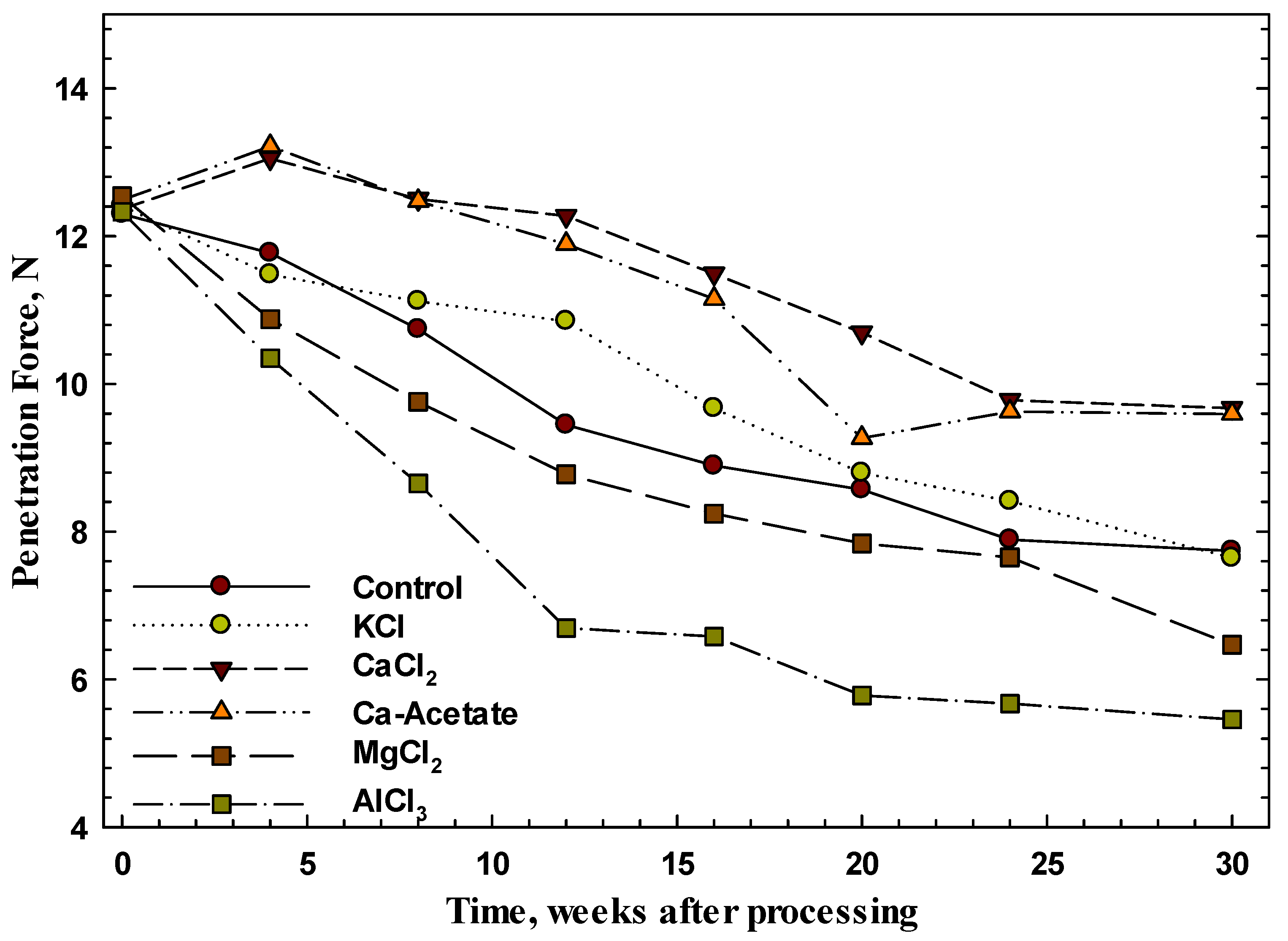 The mean peak force of fresh cucumber pickles before fermentation was about 12 N across all treatments; however, this value decreased during fermentation. These firmness values were rather higher than those reported in the previous work [32], which may be related to the type of cucumber origin and the content of salt brine solution. Moreover, firmness significantly declined in all treatments during storage, except for CaCl2 and Ca-acetate, which exhibited more firmness after 30 weeks of storage. It has also been reported that the firmness of cucumber pickles after processing and during fermentation was not changed even in comparison to the firmness before fermentation [9]. Additionally, Ca2+ exhibited greater firmness during fermentation, consistent with findings that CaCl2 reduces the softening of cucumber pickles during storage [5,6,9,15]. Firmness and resistance to softening induced by Ca have been attributed to the formation of Ca-pectates that increase middle lamella cell wall rigidity and resistance to degradation by polygalacturonase. It has been previously observed that the protection against mesocarp softening during storage occurrs when the brine contains 700 ppm Ca2+ or 300 ppm Ca2+ along with 75 ppm Al3+ [9,15,28]. The pickled cucumbers brined in NaCl (control) showed an average firmness of 8 N, while the Ca2+-brined counterparts had significantly higher firmness (~10 N) (p < 0.05), and similar results have been reported elsewhere [28,32]. The firmness of the MgCl2 samples after 30 weeks of fermentation was about 7 N, which showed a positive relation and was similar to the bay salts [33]. Accordingly, the order of firmness after six months of storage for different salts is as follows: Ca(C2H3O2)2 > CaCl2 > NaCl > KCl > MgCl2 > AlCl3. In addition, the firmness of all samples was increased by increasing the salt concentration, which may be attributed to the interactions between galacturonic acid and the ions, as previously reported for different concentrations of CaCl2 [28]. By considering the constant amount of galacturonic acid in the pickled cucumber (300 ppm) [6], the stoichiometric effects of the salts can be evaluated. Firmness of cucumber pickles is closely associated with the solubility characteristics and degree of esterification (DE) of pectic substances [33]. Moreover, the effect of thermal and fermentation on the texture of cucumber pickles have been studied, and it has been understood that the thermal degradation of firmness and crispness in fermented cucumbers follows a first-order process [31].