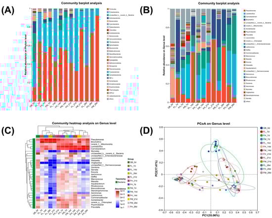 Changes rule of bacterial flora of chilled lamb under different barrier packaging. (A) Community abundance on the phylum level; (B) Community abundance on the genus level; (C) Community heatmap on the genus level; (D) PCoA on the genus level.