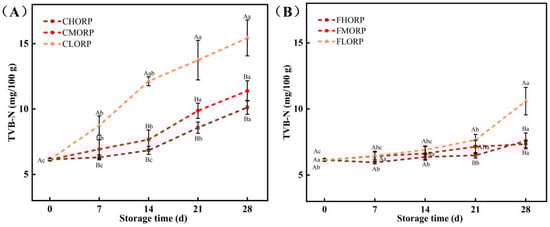 Changes in the TVB-N of chilled lamb under different barrier packaging during storage at 4 °C (A) and −1 °C (B). Different small letters (a, b, c) indicate a significant difference (p < 0.05) in storage time; at the same time point, different capital letters (A, B) indicate a significant difference (p < 0.05) among the treatments.