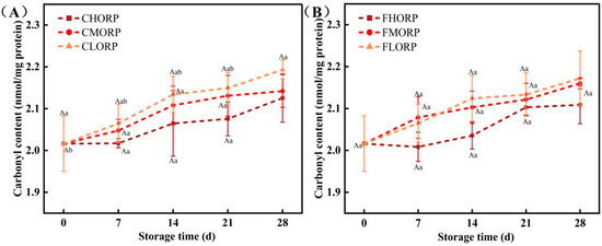 Changes in the carbonyl content of chilled lamb under different barrier packaging during storage at 4 °C (A) and −1 °C (B). Different small letters (a, b) indicate a significant difference (p < 0.05) in storage time; at the same time point, different capital letters (A) indicate a significant difference (p < 0.05) among the treatments.