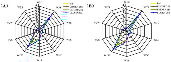 Changes in the volatile odor of chilled lamb under different barrier packaging during storage at 4 °C (A) and −1 °C (B). W1C: sensitive to aromatic components, benzene; W1W: sensitive to hydrogen sulfide; W3C: sensitive to aromatic components, ammonia; W3S: sensitive to long-chain alkanes; W6S: mainly sensitive to hydrogen; W2W: sensitive to aromatic compounds and organic sulfides; W5C: sensitive to short-chain alkanes and aromatics; W5S: sensitive to nitrogen oxides.