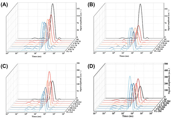 Changes in the water phase of lamb freshness under different barrier packaging during storage at 4 °C and −1 °C. T2 relaxation time: 7 d (A), 14 d (B), 21 d (C), and 28 d (D).