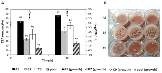 ZEA removal (%) in a liquid food model (LF) artificially contaminated with 1 µg/mL of the toxin and inoculated with B. subtilis strains A5, B7, and C9, singularly or as a pool (A). Inoculated LF was incubated for 24 and 48 h at 30 °C in aerobiosis. Bacterial load expressed as Log CFU/mL, determined after 24 and 48 h of incubation, is shown for A5 (growth), B7 (growth), C9 (growth), and the pooled strains (pool growth). a–c Different superscript letters indicate a significant difference of strains in removing ZEA from LF. y–z Different superscript letters indicate that the efficacy of strains was affected by incubation time (two-way ANOVA, Tukey test with p < 0.05 representing significance). Values represent mean ± standard deviation (error bars; n = 3). (B) appearance of A5, B7, and C9 growth in LF after 48 h of incubation. Three wells per strain are shown.