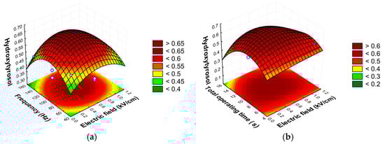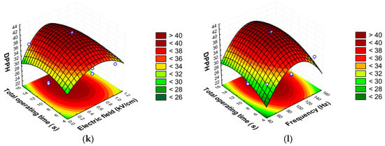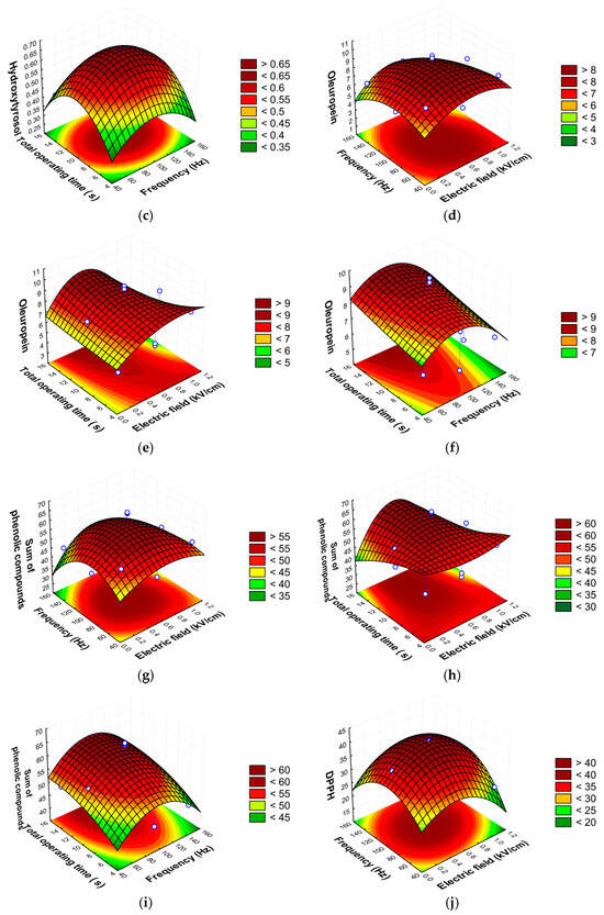 As can be seen in Table 2, the linear term β2 (frequency), all the quadratic terms (β11, β22 and β33) and the crossed term β13 showed significance for all the response variables evaluated. In addition, the linear term β1 (electric field) showed a significant effect for hydroxytyrosol and the sum of phenolic compounds, and β3 (total operating time) did for hydroxytyrosol and DPPH. In case of the crossed terms, the interaction between frequency and electric field (β12) was also significant for the sum of oleuropein and DPPH, and the interaction between electric field and total treatment time (β23) was for hydroxytyrosol. Regarding the effects, although most of the linear and crossed terms showed a negative effect, all the quadratic terms had a positive effect. This highlights the importance of not only considering the linear and direct effect between samples but also the quadratic interactions [45]. A strong correlation between the dependent variables and factors was also noted, with R2 values > 0.9 in all cases. Model validity was confirmed by ANOVA, indicating a non-significant lack of fit (p > 0.05).