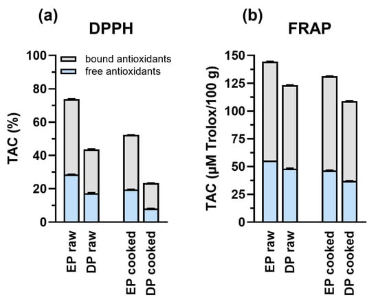 TAC was evaluated only for raw and cooked pasta samples, since bile salts and digestive enzymes used during in vitro digestion can act as antioxidants themselves, interfering with the measurements and leading to overestimated results [72,73,74,75].