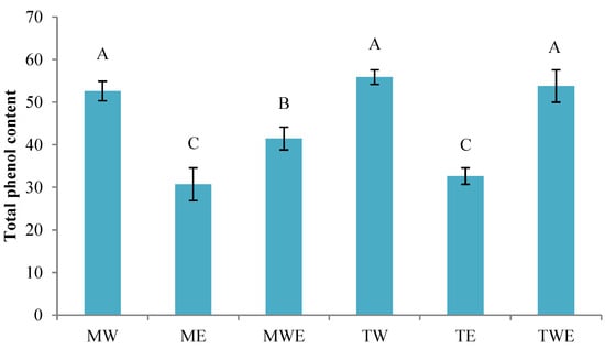 Determination of total phenolic compound contents (mg gallic acid·g−1 dried algal extract) in different algal extracts. Mean values of three (n = 3) replicates; standard deviations are indicated with bars. Mean values with different letters (A–C) indicate significant (p < 0.05) differences. Algal extract abbreviations: MW (water extract of C. myrica), ME (ethanolic extract of C. myrica), MWE (water–ethanolic extract of C. myrica), TW (water extract of C. trinodis), TE (ethanolic extract of C. trinodis), and TWE (water–ethanolic extract of C. trinodis).