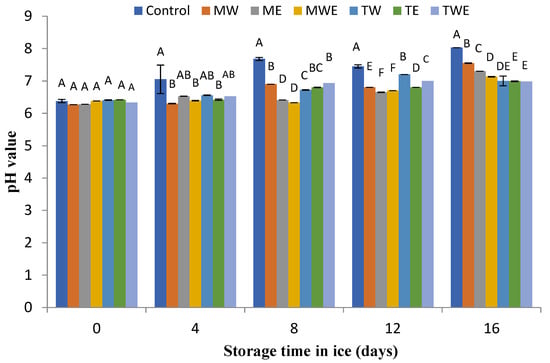 According to the present results, previous research accounts for the inhibition of a pH increase during the chilled storage by including brown algal extracts in the icing medium. This is the case of a combined ethanol–water extract of C. stricta during the chilled storage of horse mackerel (T. trachurus) for 11 days [] and an ethanolic extract of Bifurcaria bifurcata during the megrim (Lepidorhombus whiffiagonis) storage for 14 days []. Regarding red algae, Arulkumar et al. [] observed a pH decrease by including a methanolic extract of Gracilaria verrucosa in the icing medium employed during the chilled storage of Indian mackerel (Rastrelliger kanagurta) for 15 days.
