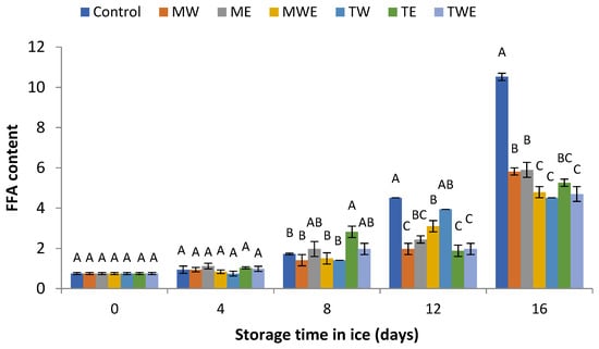 The data illustrated in Figure 3 show the changes in the FFA content of fish stored in different kinds of ice for 16 days. At day 0, fillets from all kinds of samples were characterized by a ca. 0.75 FFA level. Then, a progressive increase in all samples was observed with the storage time. However, during the 12–16-day period, the FFA content of fish samples corresponding to all alga-treated batches showed lower mean values than their corresponding Control samples; differences were found to be significant (p < 0.05) in all cases at the end of the experiment. At this time, the ice treatment with aqueous extracts of C. trinodis and aqueous–ethanolic extracts of both algae displayed the lowest average values (4.51, 4.79 and 4.70 g FFAs·100 g−1 lipids, respectively).