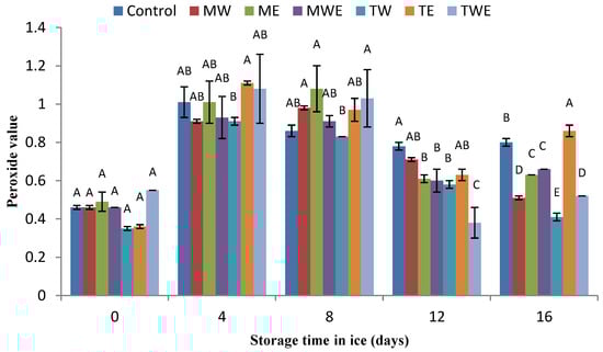 Determination of the peroxide value (meq. active oxygen·kg−1 lipids) in rainbow trout subjected to different icing systems. Mean values of three (n = 3) replicates; standard deviations are denoted with bars. Mean values with different letters (A–E) indicate significant (p < 0.05) differences. Icing systems are as expressed in Figure 1.
