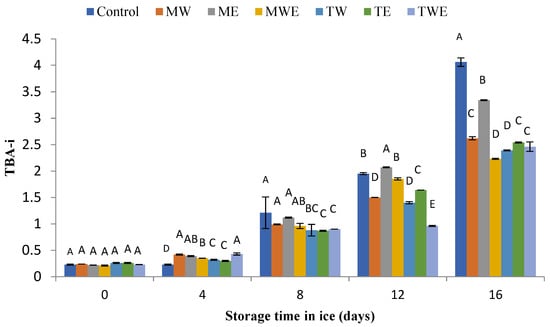 Assessment of the thiobarbituric acid index (TBA-i; mg malondialdehyde·kg−1 muscle) in rainbow trout subjected to different icing systems. Average values of three (n = 3) replicates; standard deviations are indicated with bars. Average values with different letters (A–E) indicate significant (p < 0.05) differences. Icing systems are as expressed in Figure 1.