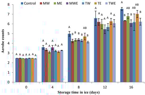 Mesophilic bacterial counting is recognized as a worthwhile tool for evaluating the quality and pollution of fishery products during or after processing [,]. In the present study, the initial total bacterial load for rainbow trout muscle ranged from 2.47 to 2.84 CFU·g−1 (Figure 6). An overall increase in the total bacterial count across all treatments was detected during storage. No differences (p > 0.05) were observed among batches during the 0–4-day period. However, lower average values were detected in all alga-treated fish than in Control samples after 8 days; such differences were found to be significant (p < 0.05) in most cases. At day 16, aqueous–ethanolic extracts of both algae led to lower (p < 0.05) aerobe counts than in the Control fish.